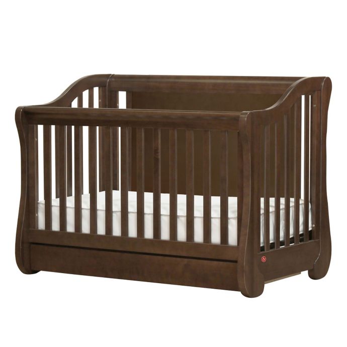 The crib creates a bold nursery centerpiece displaying graceful curves a solid three inch thick front rail and refined detailing on each slat for stylized luxury.